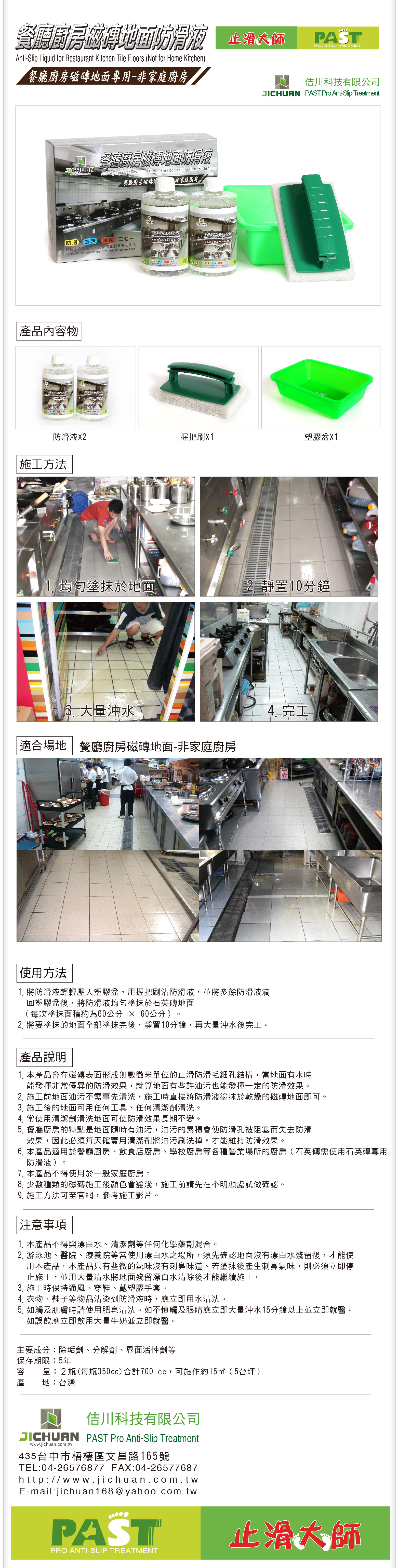 6.本產品適用於餐廳廚房、飲食店廚房、學校廚房等各種營業場所的廚房(石英磚需使用石英磚專用防滑液)。
